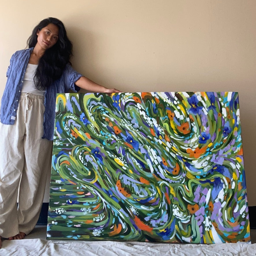 Her journey as an artist began when she was a child, as she frequently doodled and was drawn to works of Georgia O'Keeffe and Frida Kahlo. She carried her imagination into her adult life, pursuing creative fields of visual design, painting, and yoga teaching.